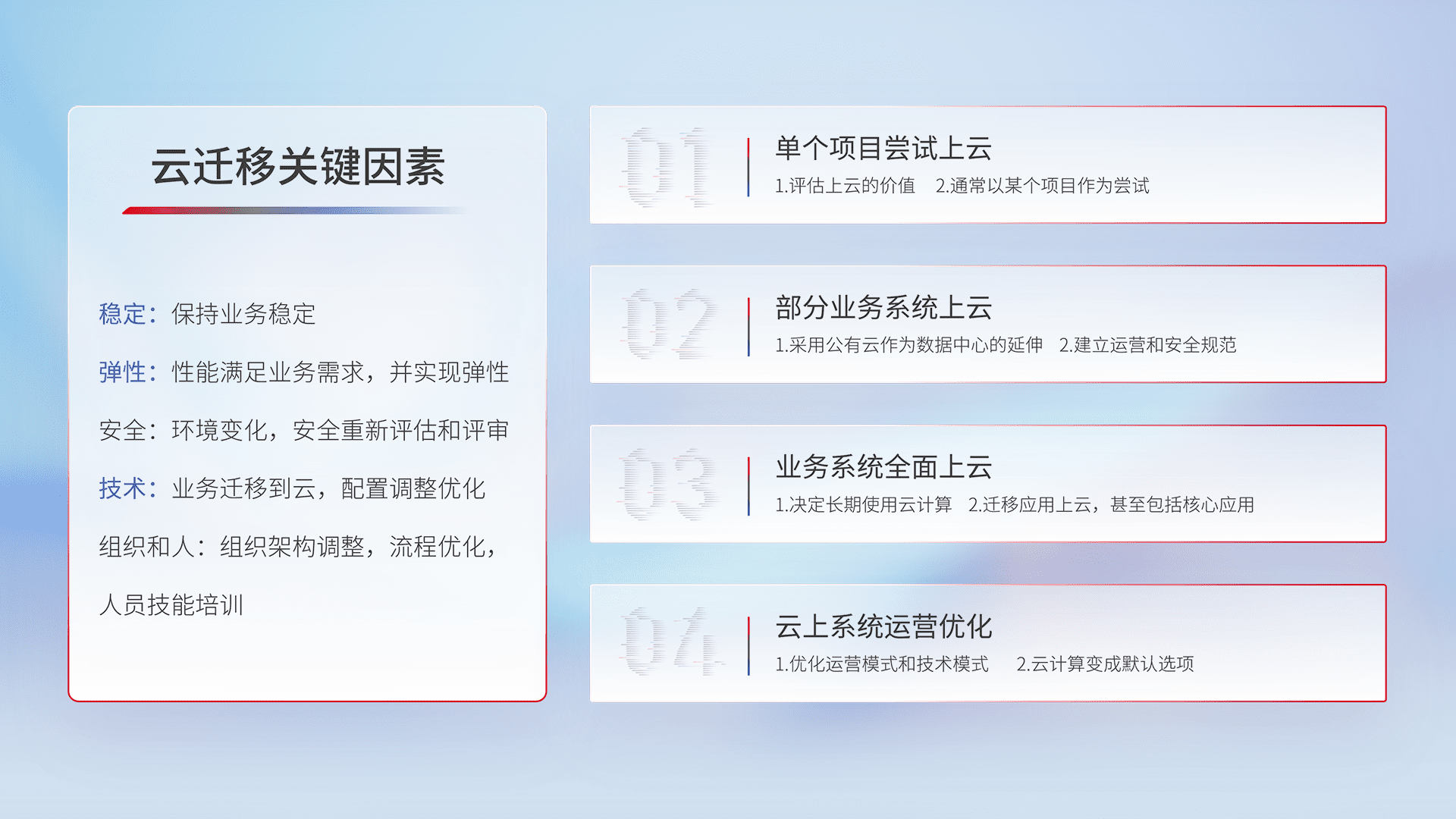 结合实际业务,,,从规划设计、、、、云平台选型、、、、云原生改造、、数据迁移、、、集成交付,,,迁移全过程为客户识别最佳上云路径,,做好风险识别管理,,,,设计网络架构、、、身份权限、、、、安全审计合规、、、、操作审计、、、、日志审计、、、监控告警策略、、多站点容灾设计等,,对云上基础设施进行整体规划,,,,提升IT治理水平,,以满足弹性、、高可用、、高性能的需求。。。。