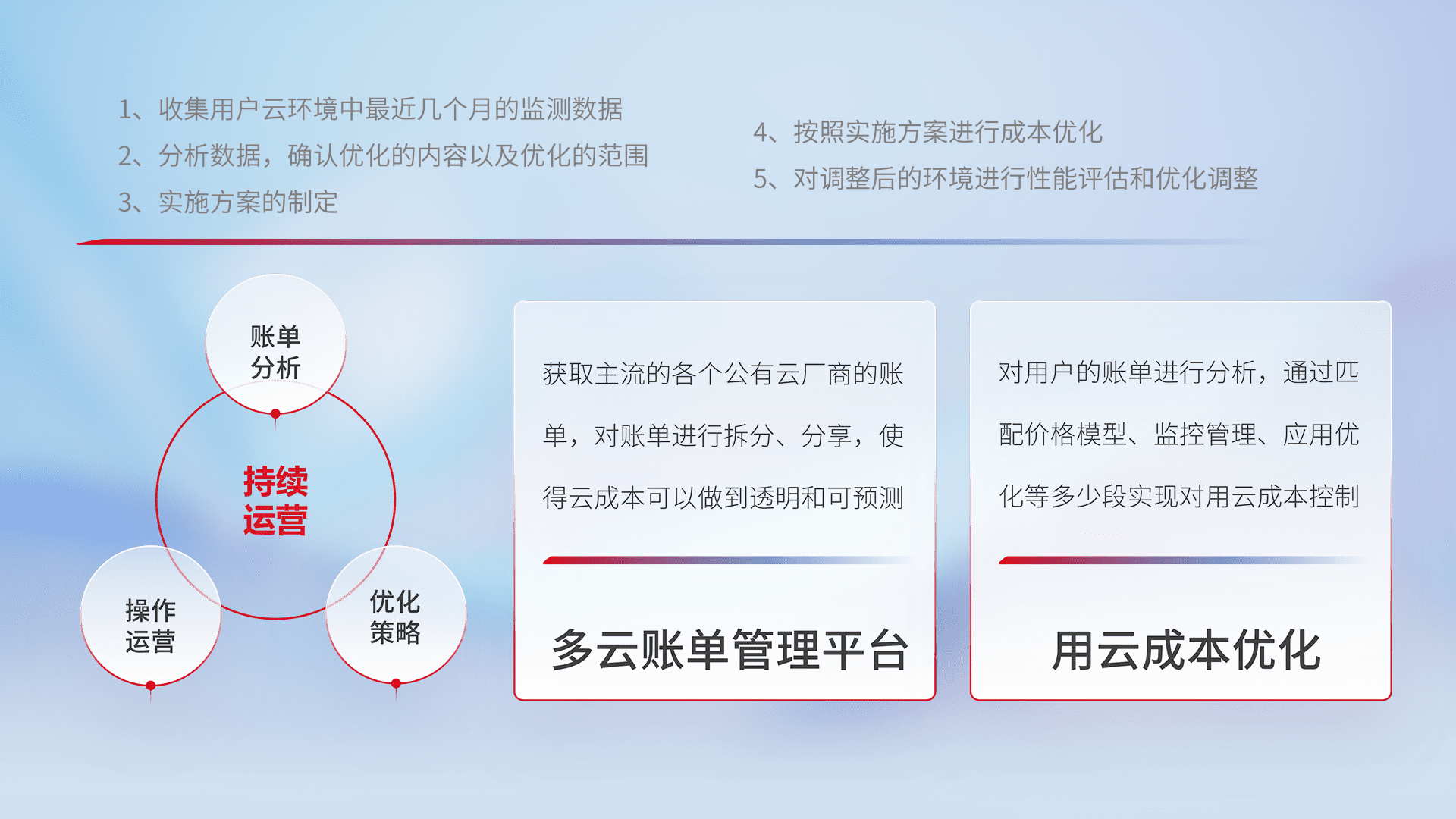 通过多云纳管,,,,以统一的资源数据模型把客户的云资源进行抽象和封装,,,,进而实现对多云资源的统一操作,,,,保障云资源管理的可靠性、、稳定性与可用性。。。。量身定制化运维内容,,,,配置、、、开发运维、、、补丁管理、、、备份、、、监控、、、认证和访问管理、、、、审计和日常巡检等,,,保障在用云过程中的可靠度,,稳定度以及高可用率。。。。